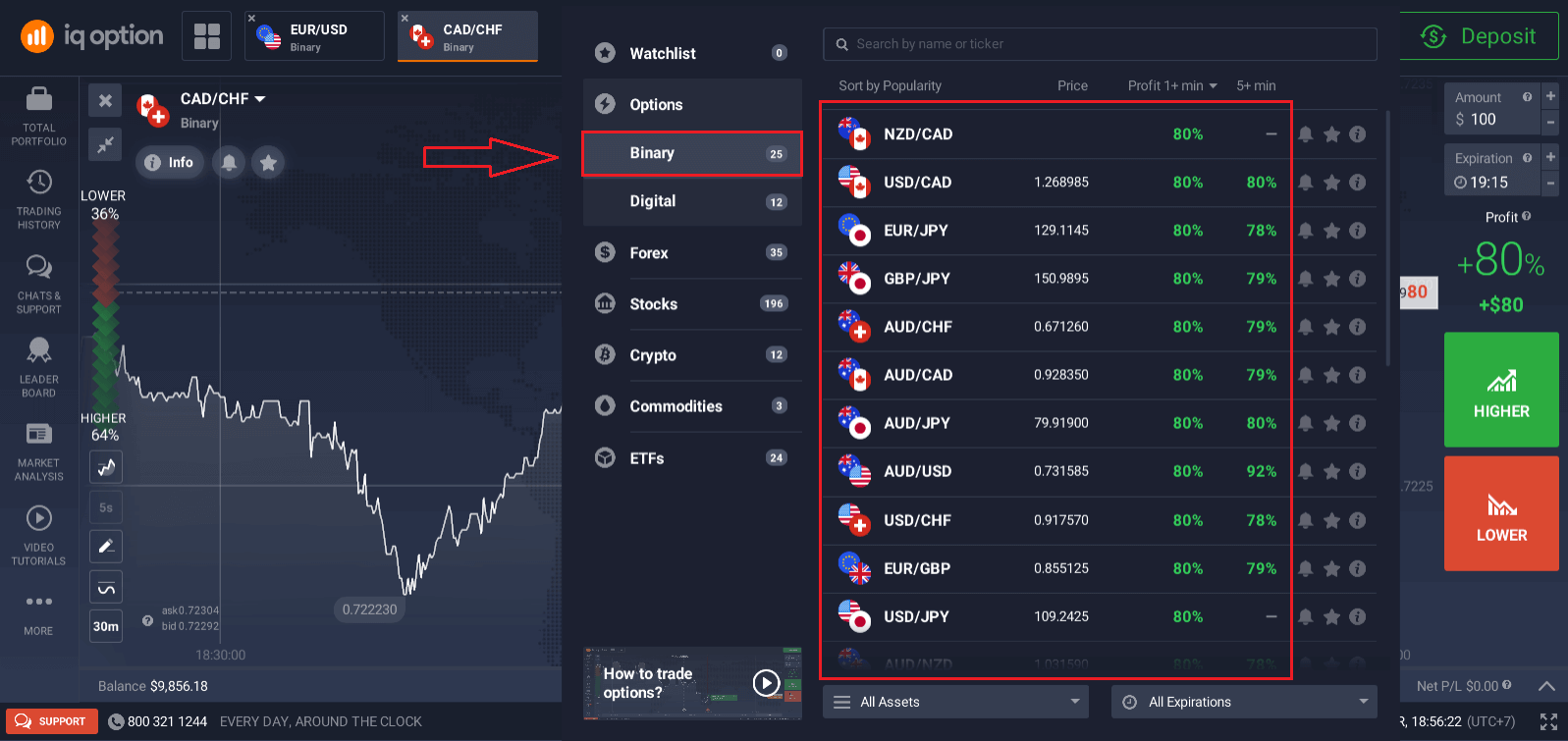 1. Select an asset. The percentage next to the asset determines its profitability. The higher the percentage – the higher your profit in case of success.Example. If a $10 trade with a profitability of 80% closes with a positive outcome, $18 will be credited to your balance. $10 is your investment, and $8 is a profit.